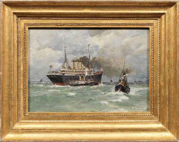 Impressionistisches, motiv- und stiltypisches Hafenmotiv Sandrocks, der sich seit 1898 alljährlich an den Großen Berliner Kunstausstellungen beteiligte. Der namhafte Kunstkritiker Max Osborn rühmte Sandrock 1912 als "eins der stärksten und hoffnungsvollsten Talente der Berliner Malerzunft" und dessen furiosen Stil. Besonders fasziniert war Sandrock von der maritimen Welt. Öl/Lwd.; R. u. sign.; 34 cm x 49 cm. Rahmen.