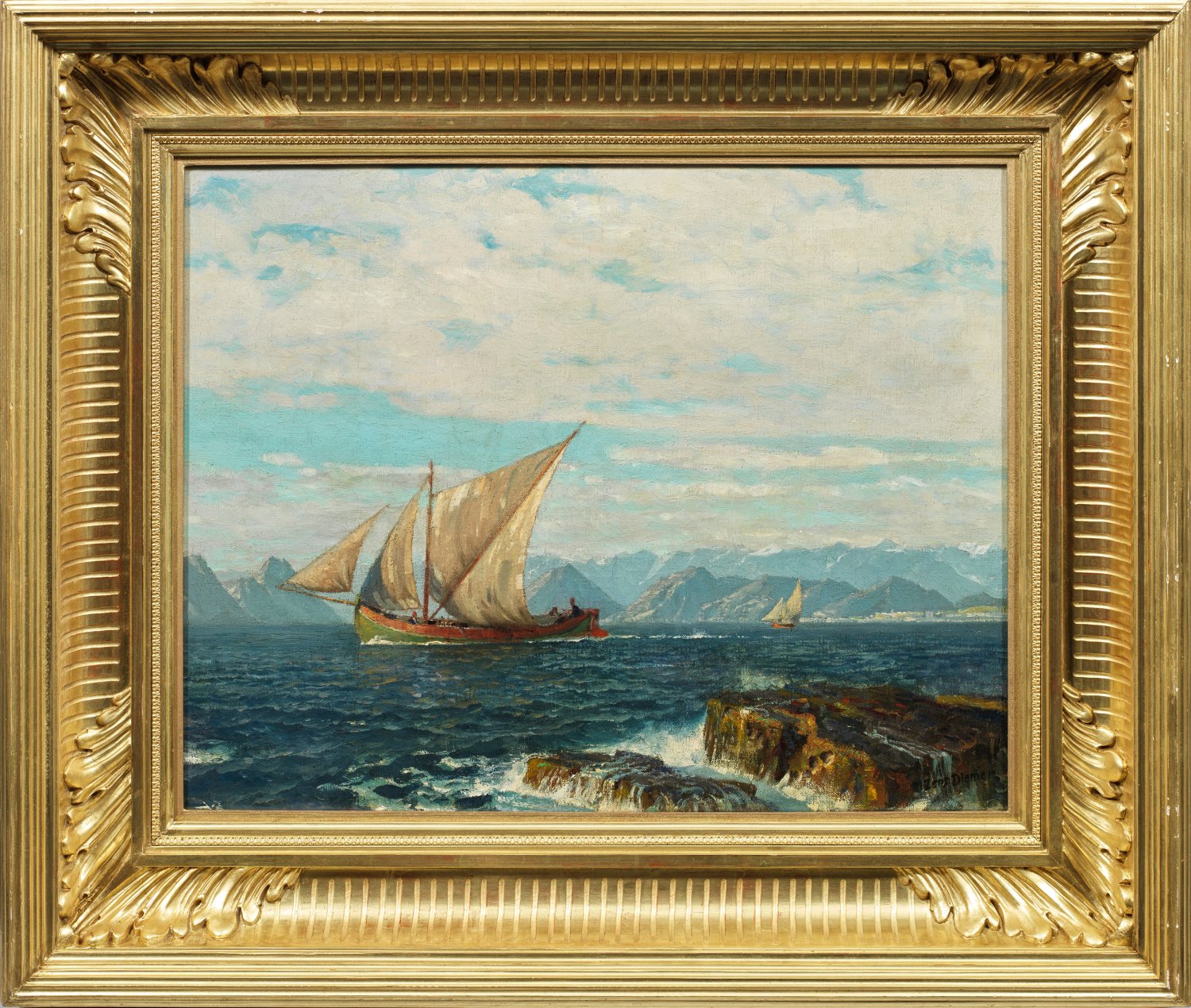 In spätimpressionistischer Weise ausgeführtes, atmosphärisch gestimmtes Werk Diemers, der an der Münchner Akademie bei Gabriel v. Hackl und Alexander v. Liezen-Mayer studierte. Seit 1900 wandte er sich einem neuen Hauptthema zu und wird mehr und mehr zum Marinemaler: Er nimmt regelmäßig an den Kreuzfahrten der HAPAG in das Nordmeer und durch das Mittelmeer teil, die auf diesen Reisen gefertigten Skizzen und Aquarelle dienen ihm als Grundlage für seine Atelierbilder. Öl/Lwd.; R. u. sign.; rückseitig bez. "In der Straße von Hÿdra"; 58 cm x 76,5 cm. Original-Rahmen.