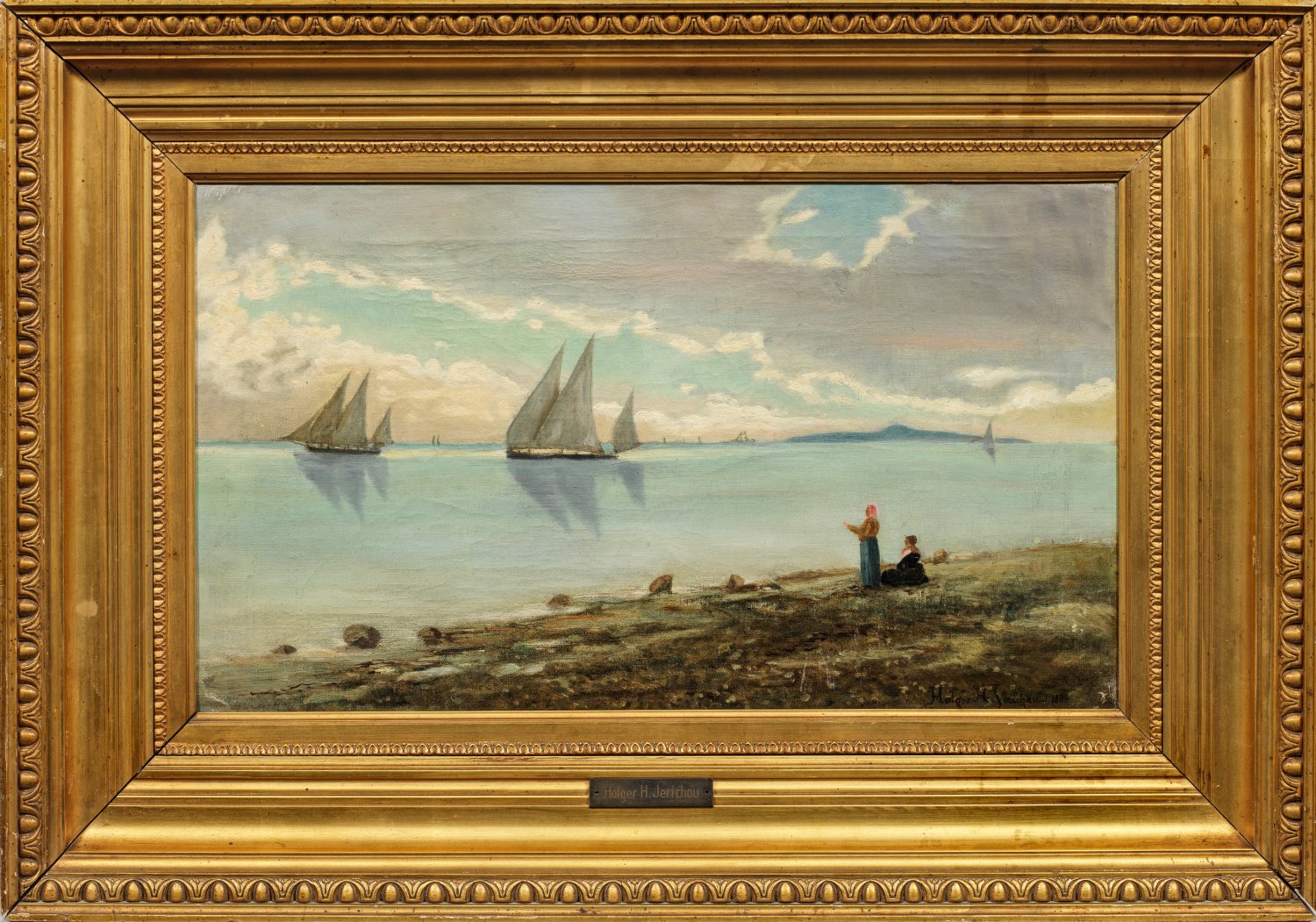 Für die dänische Malerschule charakteristische Stimmungslandschaft in hellem, von Blautönen dominiertem Kolorit. Ab 1884 stellte Jerichau Landschaften mit Italien-Motiven aus. Er lebte die meiste Zeit seines Lebens im Ausland, außer in Italien auch in Südrussland und Asien, darunter ein Jahr in Indien (1893/94). Die meisten seiner dänischen Landschaften stammen aus den Jahren 1885 und 1886, als er in der Nähe von Hørsholm lebte. Öl/Lwd.; R. u. sign. u. undeutl. dat. 188(...?). 30 cm x 52 cm. Rahmen.