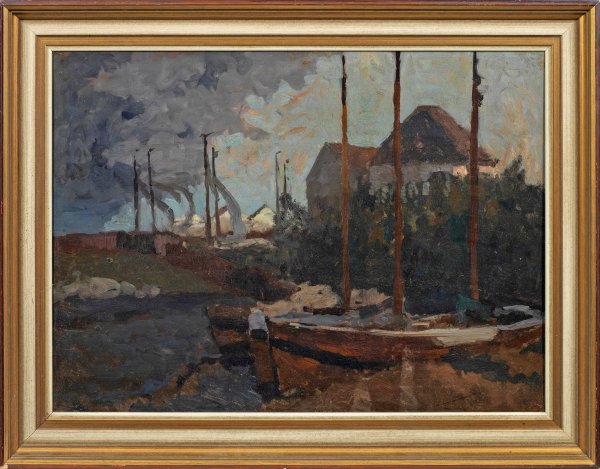 Impressionistische, norddeutsche Landschaft, wohl mit Motiv an der Unterweser oder einer ihrer Nebenflüsse. Vinnen, der mit Fritz Mackensen und Otto Modersohn in Düsseldorf studierte, gehörte zur Worpsweder Künstlerkolonie, obgleich er dort nie selbst lebte. Außer zu Mackensen und Modersohn ergaben sich Bekanntschaften zu Hans am Ende, Fritz Overbeck, Heinrich Vogeler und Paula Modersohn-Becker. Öl/Malkarton. Verso Echtheitsbestätigung von Helmut Vinnen (Neffe des Künstlers), Bremen, 21.12.1953. 52,5 x 73 cm. Rahmen.