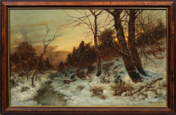 Abendlich gestimmte, tief verschneite, bewaldete Landschaft mit aufgegangenem Halbmond. Thomassin ging 1877 nach München, wo er sich der Doppelbegabung sowohl der Musik als auch der Landschaftsmalerei widmete. Er stand der Dachauer Künstlerkolonie nahe. Sein vielseitiges, künstlerisch qualitätvolles, malerisches Oeuvre umfasst neben holländischen Motiven und vielfältigen Winterlandschaften, vornehmlich Darstellungen aus dem oberbayerischen Raum und bäuerliche Genreszenen, besonders Heuernten. Öl/Lwd., doubl.; R. u. sign. mit Ortsangabe München. 62 cm x 99,5 cm. Rahmen.