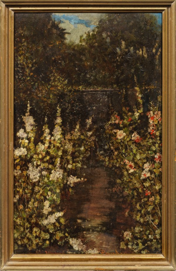 In seiner hoch gestreckten, ausschnitthaften Komposition sowie in seinem Stil repräsentatives, impressionistisches Stillleben der Künstlerin. Nach ihrer künstlerischen Ausbildung 1869-1872 in der Karlsruher Kunstschule Ferdinand Kellers eröffnete sie ihr eigenes Atelier. Wohl 1877 debütierte die noch in Karlsruhe lebende Malerin, beachtenswerterweise mit zwei Stillleben in der Berliner Akademie-Ausstellung; 1879 entsandte sie von Rom aus, wo sie offenbar auch danach öfters weilte, drei Stillleben für die Akademie-Ausstellung. Seit 1886 war sie vornehmlich in Berlin ansässig, wo sie über die Kronprinzessin und spätere Kaiserin Victoria, Zugang zum Hof hatte. 1878-1898 war sie Mitglied im Verein der Berliner Künstlerinnen, an dessen Ausstellungen sie teilnahm. Öl/Malkarton. Am Unterrand sign.; Verso bez. u. undeutl. betitelt "(...) Malven" sowie Angabe "Schloß (.../) b/ Hermann Sudermann 150 M". 70,5 cm x 44,5 cm. Rahmen.