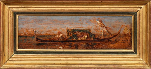 Meisterhaft, in wenigen Pinselstrichen gefertigte Gemälde-Vorstudie einer vollbesetzten, venezianischen Gondel mit Gondolieri. Ziem gehörte zur Schule von Barbizon, debütierte 1849 auf dem Salon in Paris und gehörte danach zu den regelmäßigen Ausstellern. 1860 ließ sich Ziem im Künstlerviertel Montmartre nieder. Lieblingsmotiv Ziems war Venedig, wohin er 1841-1892 alljährlich reiste. Öl/Eichentafel. Rückseitig betitelt und bez.; 14 cm x 45,5 cm. Rahmen.