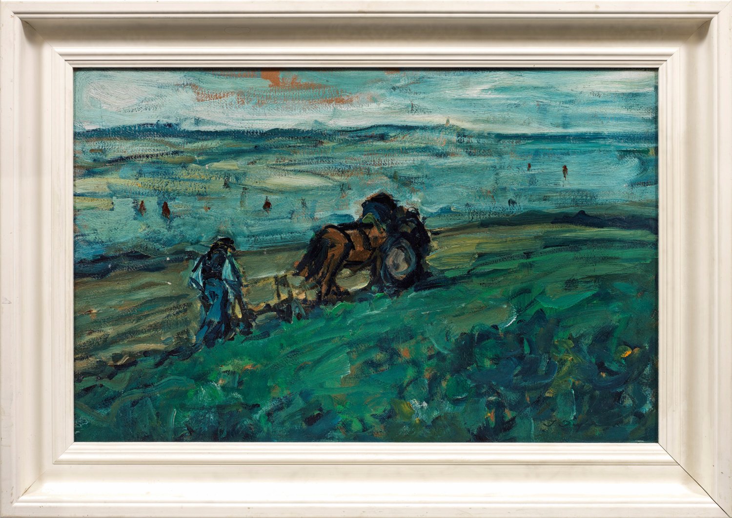 Mit breiten, impulsiven Strichen virtuos umgesetztes Motiv. Seyler, der an der Münchener Akademie bei Ludwig Schmid-Reutte, Wilhelm von Diez und Heinrich von Zügel ausgebildet wurde, entwickelte einen eigenständigen, persönlichen spätimpressionistischen Stil. 1907 zeigte die Galerie Thannhauser erstmals Gemälde Seylers, die Galerie zeigte ihn seit 1911 regelmäßig, 1913 in der legendären Armory Show in New York. 1912 reiste Seyler nach Paris und in die Betragne, wo ihn die Werke von Vincent van Gogh, Paul Gauguin und Paul Cézanne beeindruckten. In den 1920er Jahren kann Seyler an die Vorkriegserfolge anknüpfen, er erhält den Professorentitel der Akademie, wird in einer Monographie und Sonderausstellung im Münchener Glaspalast gewürdigt. Öl/Malkarton. Verso Etikett der Galerie Thannhauser, Berlin (1927 - 1937), auf weiterem Etikett betitelt "Pflügender Bauer Bretagne". 44,5 cm x 69,5 cm. Rahmen