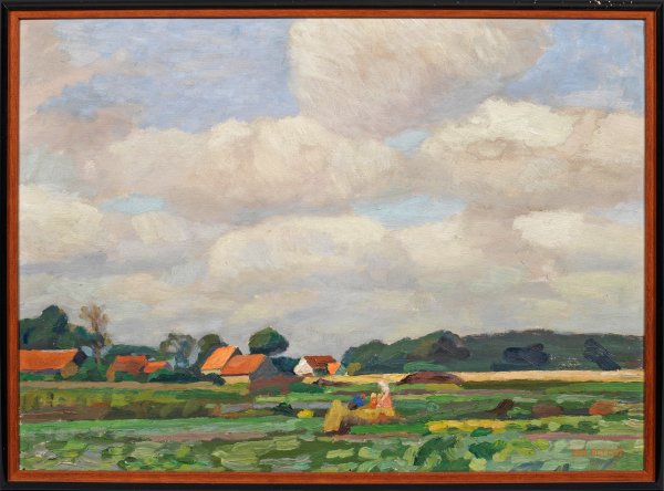 Flächige, dynamisch gemalte Landschaftsimpression des seit 1908 in Worpswede ansässigen Künstlers, der bei Albert Weisgerber in München studierte und unter dem Einfluss der Impressionisten und Postimpressionisten - besonders Paul Cézannes - zu einem eigenen Stil aus einzelnen, miteinander verwobenen Farbflächen fand. Öl/Malkarton. R. u. sign.; Ca. 47 cm x 65 cm. Rahmen.