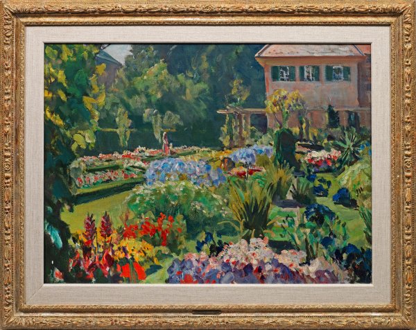 Mit virtuos lockerem Pinselduktus in leuchtendem, kontrastreichem Kolorit gemalte, sommerliche Gartenansicht, die Hübner um 1929 schuf und vermutlich ein Motiv aus der näheren Umgebung seines Wohnhauses in Neubabelsberg aufgreift (Vgl. "Aus dem Garten Dr. Jakob Goldschmidt", Neubabelsberg, 1927, Wvz.-Nr. 293). Der 1892-1895 in Karlsruhe ausgebildete, mehrfach ausgezeichnete, impressionistische Künstler wurde 1899 Mitglied der Berliner Sezession und 1914 Vorsteher eines Meisterateliers für Landschaftsmalerei an der Hochschule für bildende Künste in Berlin. Sein von Monet ausgehender impressionistischer Stil zeigt sich voller Lichtpoesie und kraftvoll bewegter Farbflächen. Öl/Lwd.; R. u. sign.; Verso Nummer 121. 67,5 cm x 92,5 cm. Rahmen.