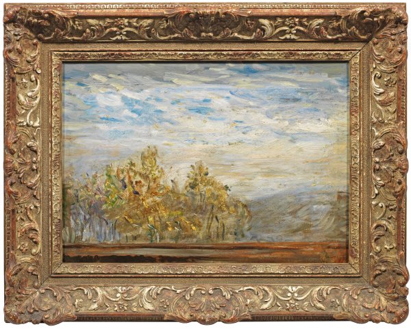 Die 1931 entstandene, mit schwungvoll lockerem, impulsivem Duktus und teilw. pastosem Farbauftrag gemalte Landschaft gehört zu den letzten Werken des bedeutendsten deutschen Impressionisten neben Lovis Corinth und Max Liebermann. Diese ist ganz auf die Gesamtstimmung angelegt und die Pinselstriche miteinander verwoben, wodurch sie im Detail einen hohen Abstraktionsgrad erhält. Im vielfältigen Oeuvre Slevogts nehmen Landschaften einen breiten Raum ein. Bereits in seiner Jugend besuchte Slevogt Landau in der Pfalz und auch die Familie Finkler in Neukastel bei Leinsweiler, wo er 1890 deren Tochter Antonie (Nini) Finkler (1864 - 1932) kennenlernte, die er 1898 heiratete. 1914 erwarb er schließlich das zuvor bereits seinen Schwiegereltern gehörende Hofgut Neukastel (heute Slevogthof Neukastel). Hierdurch fand er in der pfälzischen Landschaft zahlreiche Motive für seine impressionistische Freilichtmalerei. Von der Terrasse aus hatte der Maler einen weiten Blick in die Rheinebene und fing die Landschaft zu verschiedenen Jahreszeiten ein. Unter seinen engen Künstlerkollegen, die zu vergleichbar reifen Landschaftsschilderungen gelangten, gehörte Lovis Corinth (1858 - 1925) mit seinen expressiven Walchensee-Bildern seit 1919. Slevogt studierte 1884-1889 an der Münchener Akademie, es entstanden erste Landschaften in Neukastel. 1889/90 ging er an die Académie Julian in Paris, bevor er nach 1890 in München ansässig wurde. 1892 gehörte Slevogt zu den Gründern der Freien Vereinigung der XXIV aus der Münchener Secession. 1901 ließ er sich gemeinsam mit Lovis Corinth in Berlin nieder und wurde Mitglied der Berliner Secession. 1914 nahm ihn die Preußische Akademie der Künste in Berlin als Mitglied auf, 1917-1932 war er Vorsteher eines Meisterateliers für Malerei an der Akademie der Künste in Berlin. Öl/Hartfaser. R. u. sign.; Verso Sammlerstempel von Theodor Kiefer, Kaiserslautern. 38 cm x 54,5 cm. Rahmen.