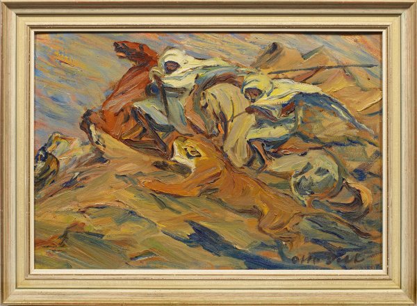 Szene aus Nordafrika mit zwei Beduinen zu Pferde im Kampf mit einem Löwen. Mit virtuos schnellem, breitem, lockerem Duktus gemaltes und pastosem Farbauftrag ausgeführtes, furios hingeworfenes, 1921 entstandenes, frühes Werk Dills. Dieses wurde mit Gewissheit durch die berühmten Löwenjagd-Gemälde von Rubens und Delacroix inspiriert. In solchen Reiter- und Löwenbildern konnte Dill zugleich seine große Meisterschaft in der Schilderung flüchtiger Bewegungsabläufe zum Ausdruck bringen. Reiter- und Pferdemotive waren neben Raubkatzen die Hauptsujets des Malers, der 1908-1914 an der Münchener Akademie studierte, 1909-1913 als Meisterschüler bei Heinrich von Zügel. Anfang der 1920er Jahre befasste sich Dill mehrfach mit dem Motiv der Löwenjagd; 1922 zeigte Dill in der Großen Berliner Kunstausstellung eine vergleichbare "Löwenjagd" und 1922/23 arrangierte die Moderne Galerie Thannhauser in München eine Dill-Ausstellung mit einer Reihe neuester Gemälde, in der auch das vorliegende gezeigt worden sein dürfte. 1923 erschien in der maßgeblichen Kunstzeitschrift "Die Kunst für alle" (S. 259-265) ein längerer Artikel über Dill von dem Kunsthistoriker Dr. Willy Burger, der auch über seine Löwenjagdbilder schreibt: "Zu den besten Bildern des Künstlers zählen wohl jene Darstellungen der höchsten Steigerung der Bewegung, des Kampfes, wenn das gehetzte Raubtier und Roß und Reiter in einem einzigen, wilden Knäuel sich wälzen, ein Bild aufregendsten, packendsten Lebens (...) Der kühnen, großen Geste der Kampfbilder entspricht durchaus die Wucht und Energie der Pinselführung, die gleich Fanfarenstößen im Bilde aufleuchtenden Farbmassen, die in breiten, großen Flächen die Leinwand rhythmisch gliedern.". Öl/Malkarton. R. u. sign.; überdies verso auf einem Etikett sign., betitelt u. dat. 1921; Etikett der Modernen Galerie Thannhauser, München (1921-1928) mit Nr. 3853. 47 cm x 69,5 cm. Rahmen.