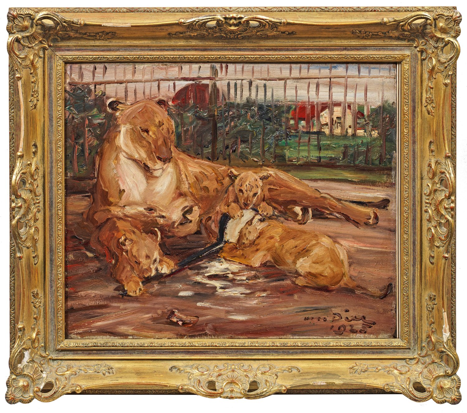 In starker Nahsicht geschilderte, ruhende Löwin mit drei Jungen im Zoologischen Garten (Tierpark Hellabrunn) in München. 1925 geschaffen, gehört das Gemälde sowohl durch sein Motiv als auch durch seinen impressionistischen Stil mit schnellem, breitem Duktus und pastosem Farbauftrag zu den charakteristischen Werken Dills aus seiner besten Schaffensperiode. 1908-1914 studierte Dill an der Münchener Akademie, 1909-1913 als Meisterschüler des Tiermalers Heinrich von Zügel, der ihm das Interesse an Tieren und den Impressionismus vermittelte. Schon seit Kindheit an faszinierten Dill insbesondere Raubkatzen. Anders als Zügel, der vor allem Schafe und Rinder malte, widmete sich Dill daher außer Pferden und Reitern nicht zuletzt Löwen und Tigern als Hauptmotive seine Oeuvres. Bereits im Sommer 1917 war Dill mit einer ersten, umfangreichen Kollektion von Ölgemälden und Zeichnungen bei der Ausstellung im Münchener Glaspalast vertreten, die vornehmlich Löwen- und Pferdemotive zeigen. Als Mitglied der Münchner Sezession nahm er 1922-1930 an verschiedenen Ausstellungen der Künstlervereinigung teil. 1923 erschien in der maßgeblichen Kunstzeitschrift "Die Kunst für alle" (S. 259-265) ein längerer Artikel über Dill und seine Löwen- und Pferdebilder vom Münchener Kunsthistoriker Dr. Willy Burger, in dem es treffend heißt: "sein Lieblingstier, das seinen Intentionen am besten entspricht, ist das Raubtier aus der ersten Klasse der großen Katzen, Löwen und Tiger. Ihnen merkt man selbst in der Ruhe das immerwährende Auf-der-Lauer-Liegen, das Angespannte jeden Nervs und Muskels im Kampfe um das Dasein an. Der mächtig dahinschreitende Gang der Löwin (..) findet in Dills Bildern eine beredte und charakteristische Interpretation". Hierdurch wurde der Künstler auch unter dem Spitznamen "Löwen-Dill" bekannt. 1924 erhielt Dill den Professorentitel, 1930 ging der Künstler von München nach Neustadt an der Weinstraße, 1941 zog er nach Bad Dürkheim. Neben Max Slevogt zählt Otto Dill heute zu den bedeutendsten Künstler der Klassischen Moderne aus der Pfalz. Öl/Lwd.; R. u. sign. u. Dat. 1925. Verso auf Original-Etikett vom Künstler bez. u. betitelt. 50,5 cm x 60,5 cm. Rahmen.