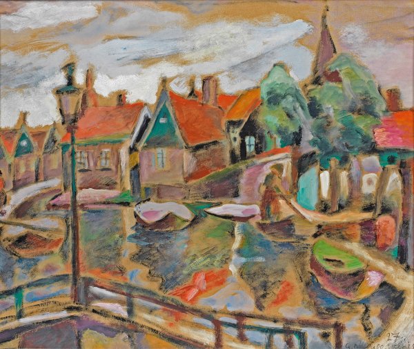 Expressionistisches Werk Dollerschells, einem wiederentdeckten Künstler der sog. Verlorenen Generation. Seine künstlerische Ausbildung erhielt er u. a. an der Münchner Kunstakademie bei Angelo Jank und Franz von Stuck, seit 1912 in Paris. Dort begegnete er Wilhelm Lehmbruck, stellte 1912 erstmals im Salon d’Automne seine "Junge Pariserin" aus. Nach dem I. Weltkrieg geht Dollerschell nach Wuppertal, 1923 wurde er durch einen großen Artikel über ihn in der "Deutschen Kunst und Dekoration" weiter bekannt. Seit 1927 lebte Dollerschell wieder einige Jahre in Paris. Nach 1933 werden viele seiner Werke in Deutschland als "entartet" verfemt und aus öffentlichem Kunstbesitz entfernt. Ein Großteil seines Oeuvres wurde 1943 bei einem Luftangriff auf Wuppertal zerstört. Gouache/Papier, auf Karton kaschiert. R. u. sign. u. dat. (19)27. 37,5 cm x 45,5 cm (Darstellung). Rahmen.