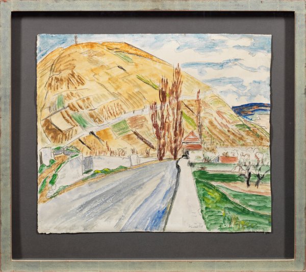 1928 entstanden, zeigt das Blatt einen Blick auf eine fränkische Landschaft bei Würzburg. Dominant die größte Bildfläche einnehmend, erhebt sich ein mächtiger Weinberg, der in rechteckige Flächen in Gelb-, Grün- und Brauntönen unterteilt ist. Vom Vordergrund ausgehend führt eine Straße oder ein von Mauern begrenztes, schmales Flussbett als spannungsreicher Keil auf den Weinberg zu, im Mittelgrund ein Gebäude und aufragende, herbstliche Pappeln. Der Expressionist Erich Heckel unternahm nach dem I. Weltkrieg von Berlin aus immer wieder Reisen, nicht nur an die Ostsee, sondern 1927 und 1928 auch für mehrere Wochen nach Würzburg. Hierbei war Heckel mit seiner Frau Siddi Gast bei der Malerin Gertraud Rostosky, die in dem ehemaligen Landgut "Neue" Welt" in Würzburg 1920 eine Künstlerkolonie gegründet hatte. Heckel schuf eine bedeutende Werkreihe von Ansichten der Residenzstadt Würzburg mit der imposanten Festung Marienberg und der Umgebung, sowohl Aquarelle als auch Gemälde. Aquarell u. farbige Kreiden/Bütten. R. u. sign. u. dat. (19)28. 51,7 x 61,5 cm. Rahmen.