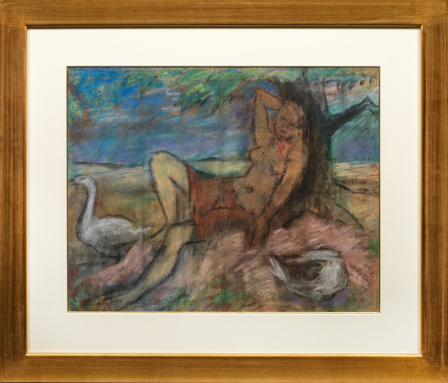 Expressionistisches Werk Kothers, das in Motiv und Stil durch Otto Mueller beeinflusst ist, mit dem er seit Studienzeiten befreundet war und dessen Schwager er 1909 wurde. Kother gehört zu den bedeutenden wiederentdeckten Künstlern der sog. "verschollenen Generation". Prägend wirkten auf ihn die mit Mueller ebenfalls zur Künstlergruppe "Brücke" gehörenden Maler Max Pechstein und Erich Heckel. 1914 ging Kother nach Berlin, wo ihn Herwarth Walden 1916 zusammen mit Max Pechstein und Lyonel Feininger in seiner "Sturm"-Galerie zeigte. Ab 1918 reihten sich die Erfolge: 1919 beteiligte er sich mit der "Novembergruppe" an der Großen Berliner Kunstausstellung, 1921 widmete ihm die Galerie Moeller eine Einzelausstellung; 1922 erhielt Kother durch Max Liebermann den Ehrenpreis der Preußischen Akademie der Künste. Pastell/Papier. 52 cm x 67 cm (Passepartoutausschnitt). Rahmen.
