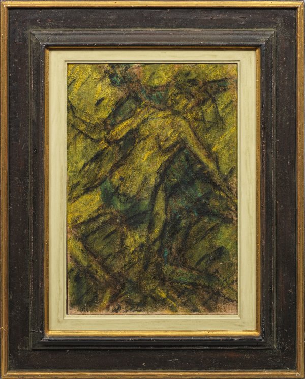 Expressionistisches, in dominierenden gelben und grünen Tönen gemaltes, 1928 geschaffenes Werk aus dem Spätwerk von Christian Rohlfs (1927 - 1938) am Lago Maggiore. Die dem Betrachter zugewandte Frau ist als Akt geschildert, die winkeligen Linien der Pinselstriche korrespondieren mit dem ekstatischen Ausdruck des wilden Tanzes. Das Gemälde entstand ein Jahr, nachdem Rohlfs 1927 Urlaub am Lago Maggiore gemacht hatte und ins Tessin (Schweiz) übersiedelte. Rohlfs gelang es im letzten Lebensjahrzehnt seine Ausdrucksmittel noch einmal zu steigern, so dass sein Spätwerk auch als Quintessenz seines Malerlebens gesehen werden kann. Meist malte er Blumen, Landschaften und Stadtansichten in großer Farbintensität. Das Thema des Tanzes durchzieht das Oeuvre von Rohlfs, seit er sich um 1906 dem Expressionismus zuwandte. In einer 1927/28 entstandenen Werkgruppe, zu der auch das vorliegende Tempera-Gemälde gehört, knüpfte er an seine früheren Arbeiten von 1908-1913 mit Tanz-Motiven an. Sie spiegelt seine bis ins Alter ungebändigte, ungebrochene Lebensfreude wider. In der Weimarer Republik war Rohlfs ein hoch geachteter Künstler. 1919 fand in der Nationalgalerie in Berlin eine große Sonderausstellung zum 70. Geburtstag statt, 1924 ehrte man ihn in Berlin mit der Mitgliedschaft in der Preußischen Akademie der Künste. Im "Dritten Reich" gehörte auch Rohlfs zu den von den Nationalsozialisten als "entartet" verfemten Künstlern der Moderne. Über 400 Arbeiten wurden 1937 aus deutschen Museen beschlagnahmt, er erhielt Ausstellungsverbot und wurde am 7. Januar 1938, einen Tag vor seinem Tod, aus der Akademie der Künste ausgeschlossen. Tempera mit Kreide-Überarbeitungen/ Lwd.; R. u. monogr. u,. dat. (19)28. 54,4 x 37,5 cm. Rahmen.