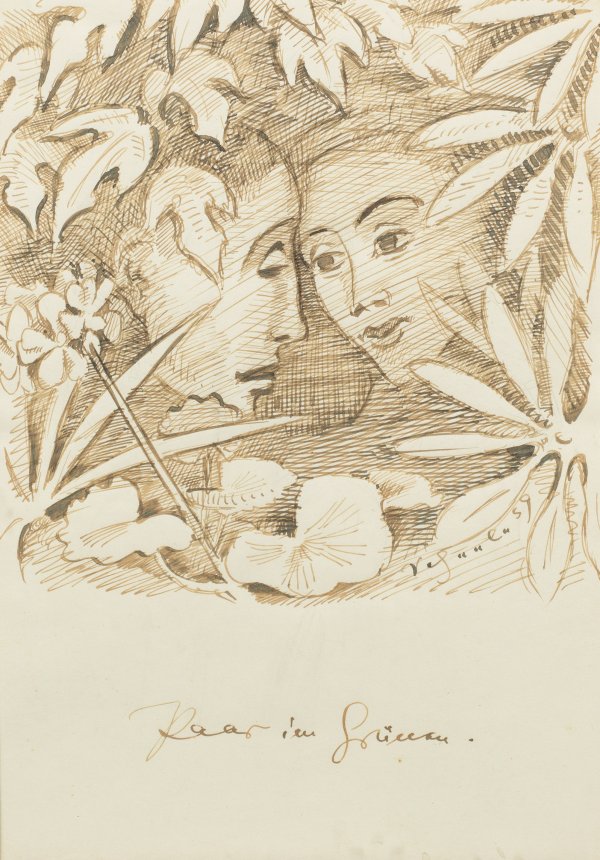 Seltenes ornamental-figurales Blatt Scheeles, der zu den Künstlern der verschollenen Generation zählt. Ab 1922 ausgebildet an der Frankfurter und der Offenbacher Kunstgewerbeschule bei Albert Windisch und Rudolf Koch, wechselte er 1924 an die Frankfurter Städelschule zu Franz Karl Delavilla, einem Vertreter des Expressionismus. 1927 ging er nach Berlin, wo er erste Ausstellungserfolge feierte und in den 1930er Jahren zur Abstraktion fand. 1937 wurden jedoch erste Werke Scheeles als "entartet" verfemt und 1939 erhielt er ein generelles Ausstellungsverbot. Viele seiner Arbeiten wurden 1943 zusammen mit seinem Atelier durch Kriegseinwirkungen zerstört. Federzeichnung in Sepia/Papier. R. u. sign. u. dat. (19)39 sowie mittig betitelt. Verso Nachlassetikett mit Nr. Z54. Ca. 28 cm x 20 cm (Passepartoutausschnitt). Rahmen.