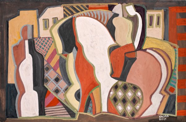 Flächig gestaltete, kubistische Komposition in kontrastreichem Kolorit. Exemplarisches Werk Kádárs, einem der bedeutendsten ungarischen Künstler der Moderne, der ab 1902 in Budapest bei Ede Balló studierte. Die künstlerisch produktivste Phase seines avantgardistischen Schaffens hatte Kádár 1922-1932 in Berlin, wo er schon 1923 in der "Sturm"-Galerie ausstellte. Neben dem Kubismus, dem Futurismus und dem Konstruktivismus zog er sich seine Inspiration besonders aus dem deutschen Expressionismus. Gouache/Papier. R. u. sign.; Verso monogr. sowie ungarisch betitelt und mit Werkangaben versehen. Blatt 30,3 cm x 46,8 cm.
