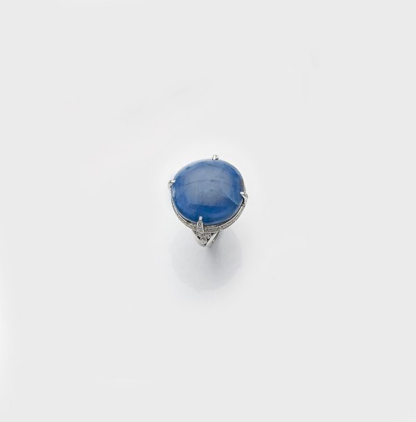 Ring set with a Burma star sapphire approx. 53,25 ct. (no indications of thermal treatment) and diamonds approx. 0,46 ct., in 18 k white gold. Certificate included.