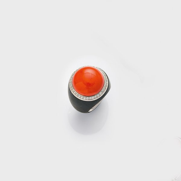 Weißgold, gest. 750. Zentral besetzt mit einem lachsfarbenem Korallencabochon, entouriert von Brillanten. Ebenholz-Ringschiene. Sehr schöne Goldschmiedeausführung des Münchner Schmuckdesigners. Herstellerzeichen. Gew. ca. 35,96 g.