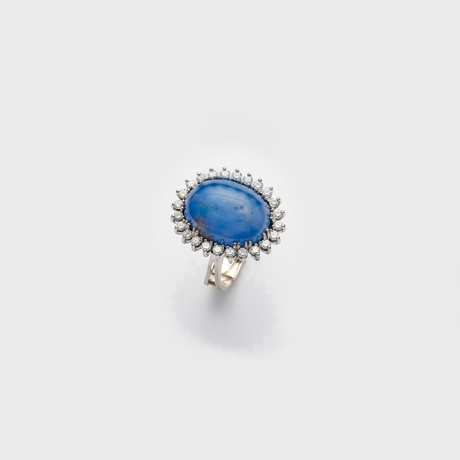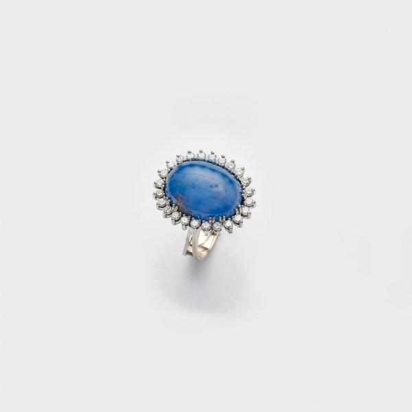Weißgold, gest. 750. Zentral besetzt mit einem hellblauen Sternsaphir-Cabochon von ca. 43,40 ct., entouriert von Brillanten von zus. ca. 1,32 ct. (H-I/lr-vvs). Gew. ca. 22,28 g.