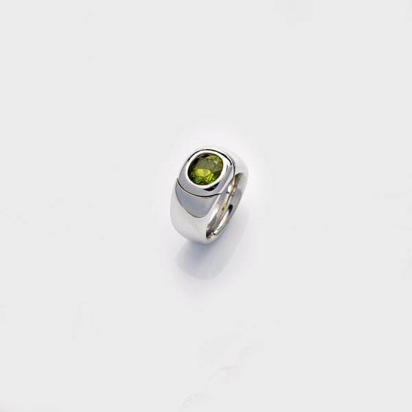 Ring by Johannes Hundt set with an apple green peridot, in 18 k white gold.