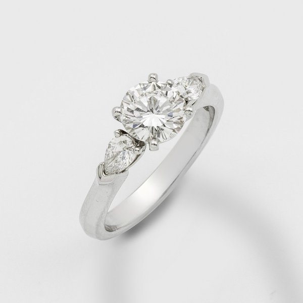 Weißgold, gest. 750. Zentral besetzt mit einem Brillantsolitär von ca. 1,33 ct. (F-G/vvs), flankiert von 2 Diamanttropfen von zus. ca. 0,30 ct.; Gew. ca. 4,22 g.