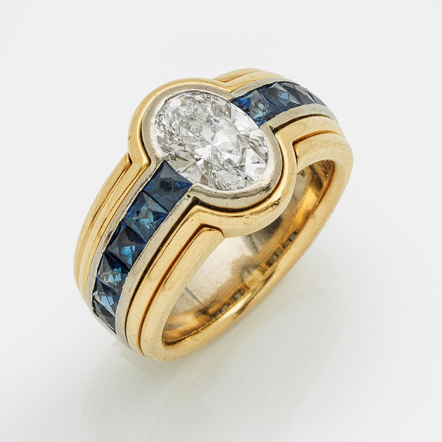 Gelb- und Weißgold, gest. 750. Zentral besetzt mit einem Diamantsolitär von ca. 1,24 ct. (D/if) im Ovalschliff, flankiert von kornblumenblauen Saphircarrées von zus. ca. 1,46 ct.; Sehr schöne Goldschmiedeausführung des vielfach international preisgekrönten Haaner Schmuckdesigners. Herstellerzeichen. Gew. ca. 12,03 g.