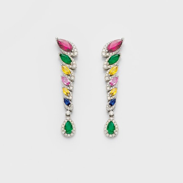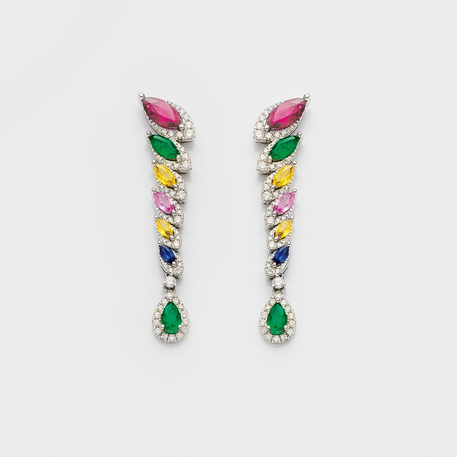 Pair of earrings set with cornflower blue, pink and yellow sapphires, pigeon blood red rubies, emeralds approx. 2,40 ct. and diamonds approx. 0,70 ct. (G-H/vs1), in 18 k white gold.