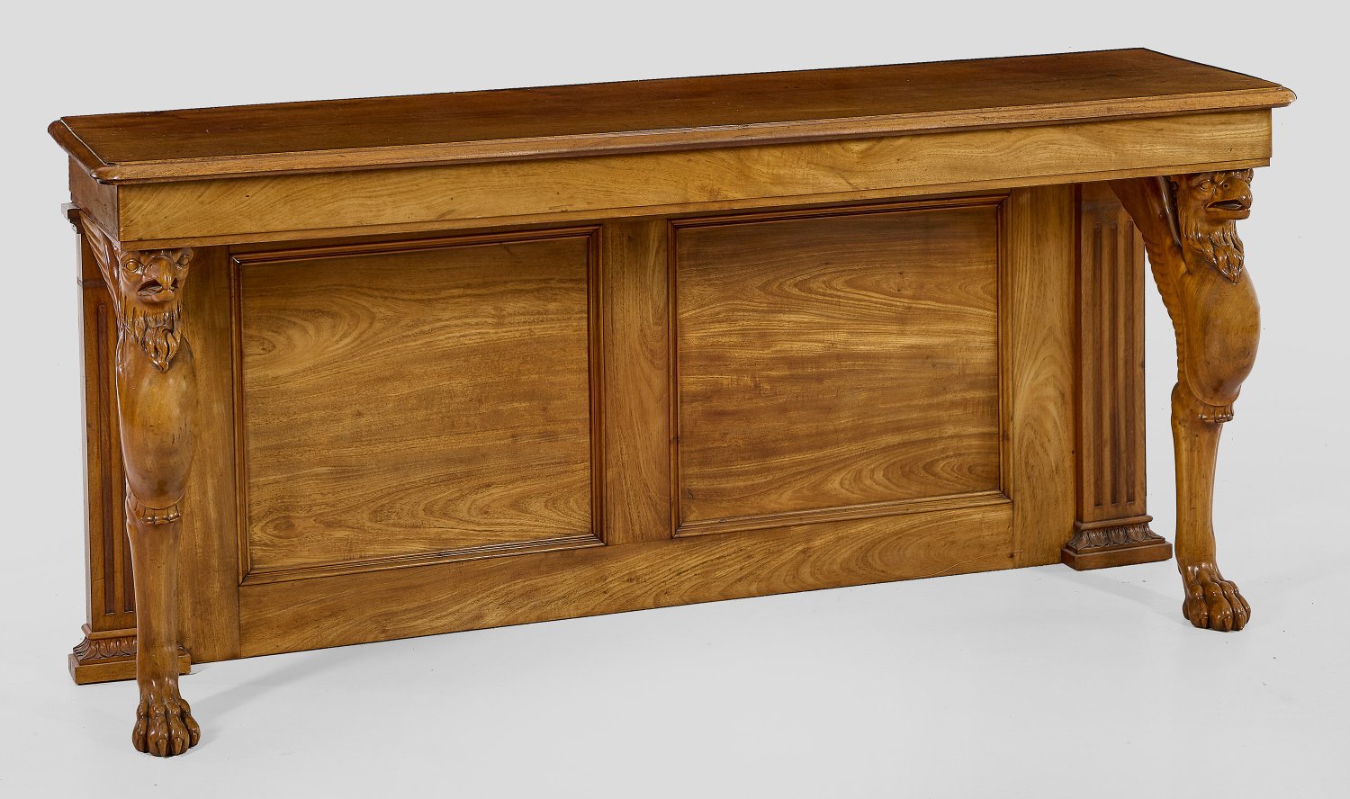 Helles Mahagoni, teilw. reliefplastisch geschnitzt. Geschwungene Beine aus vollplastisch gestalteten Greifenfiguren sowie kassettierte Rückwand, flankiert von kannelierten Pilastern als Träger für gerade, an den Ecken gerundete Zarge und gering überstehende, profilierte Deckplatte. H. 78 cm. 170 cm x 46,5 cm.