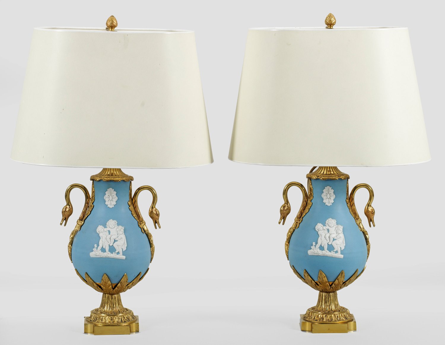 1-flg.; Gelbblaue, sog. Jasperware mit weißen Reliefauflagen sowie vergoldete Bronze. Über geschweift ansteigendem Sockel mit flächendeckendem, reliefiertem Palmettendekor balusterförmiger Korpus mit aufgelegten Lanzettblättern sowie geschwungenen Henkeln aus Schwanenhälsen. Erhaben reliefierte Puttengruppen und Rosettenmotive. Konischer, ovaler Lampenschirm. Elektrifiziert. H. 72 cm.