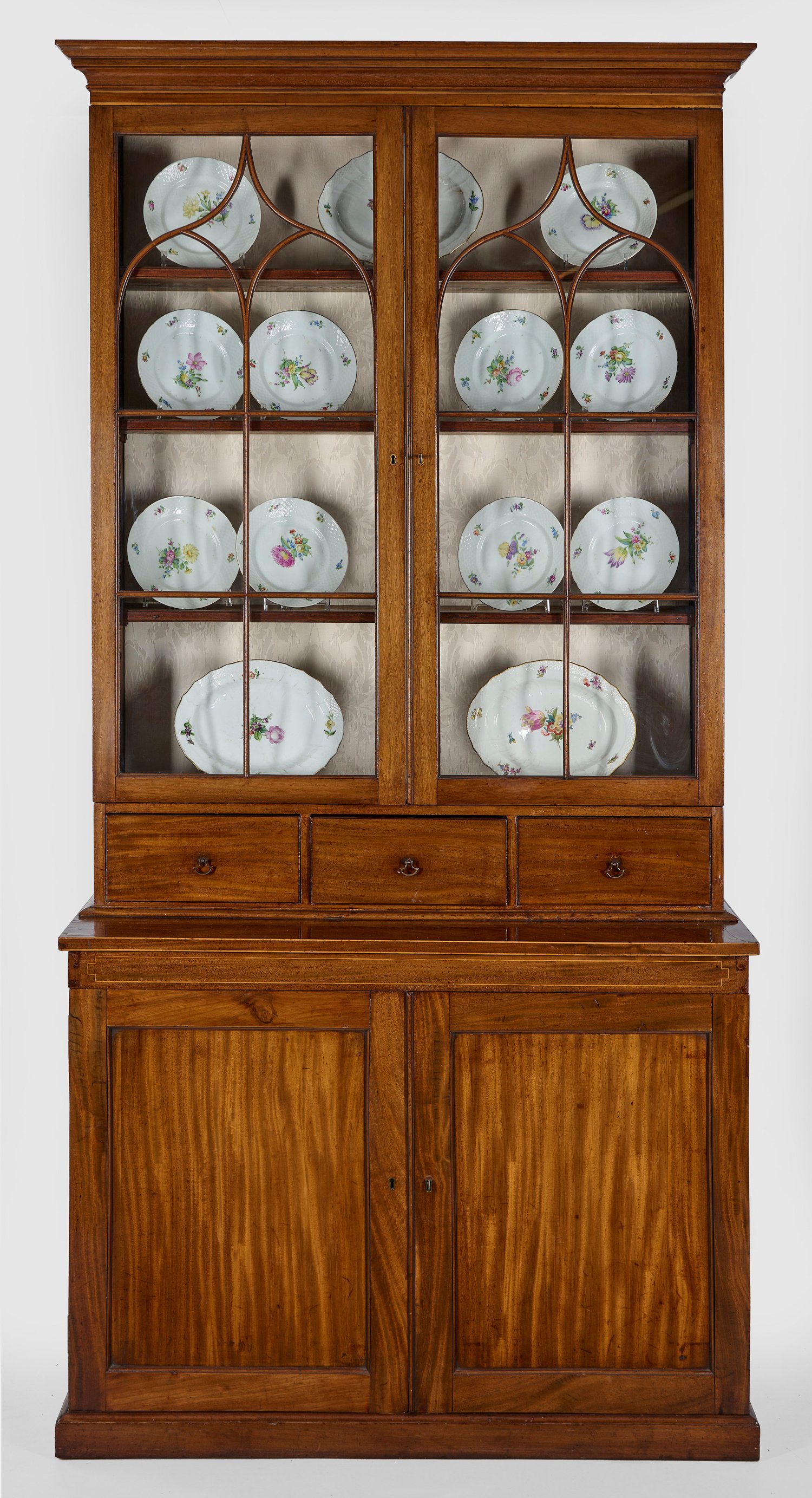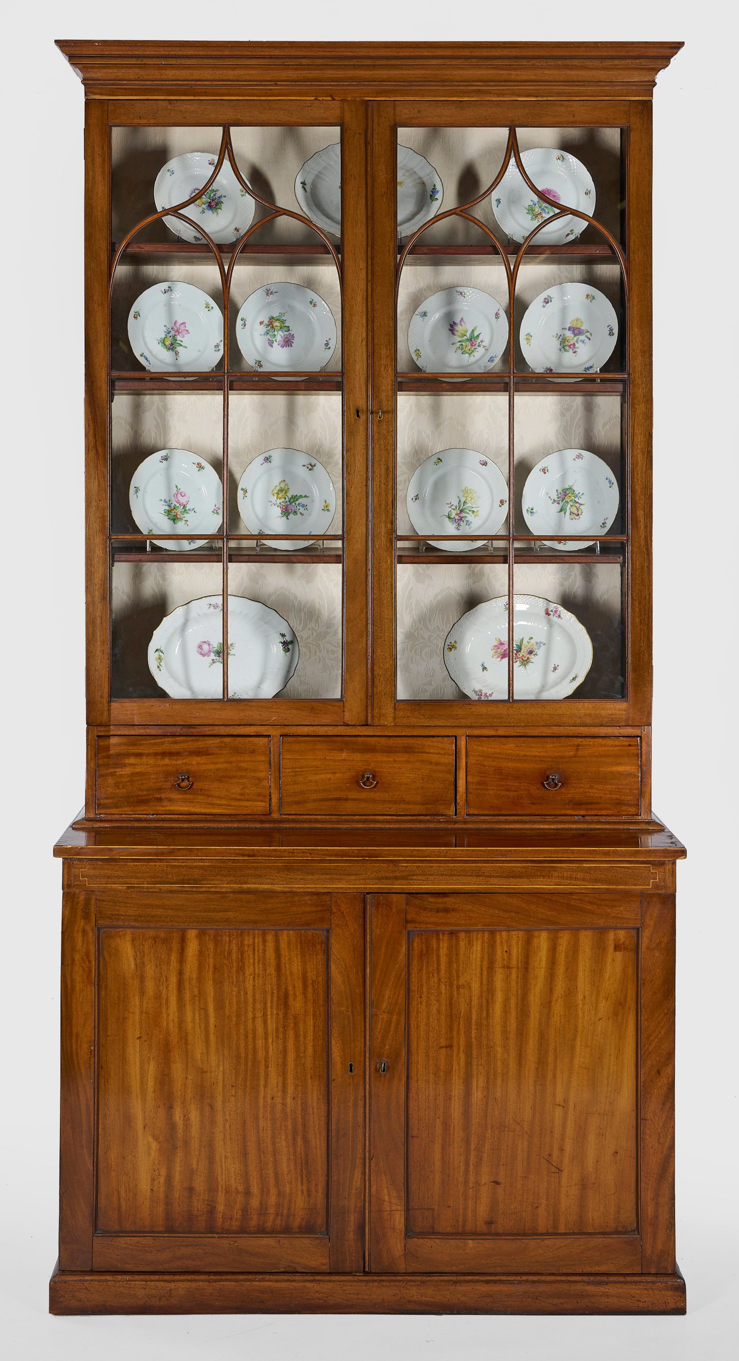 Mahagoni, furniert. Gerader, zweitüriger Korpus auf flacher Profilzarge. Gering überstehende Deckplatte. Weit zurückgesetzter, sprossenverglaster Vitrinenaufsatz mit drei Schubladen sowie vorkragendem Gesims. Ein Unterschrank innen verändert. H. 241 cm. 123 cm x 49 cm.