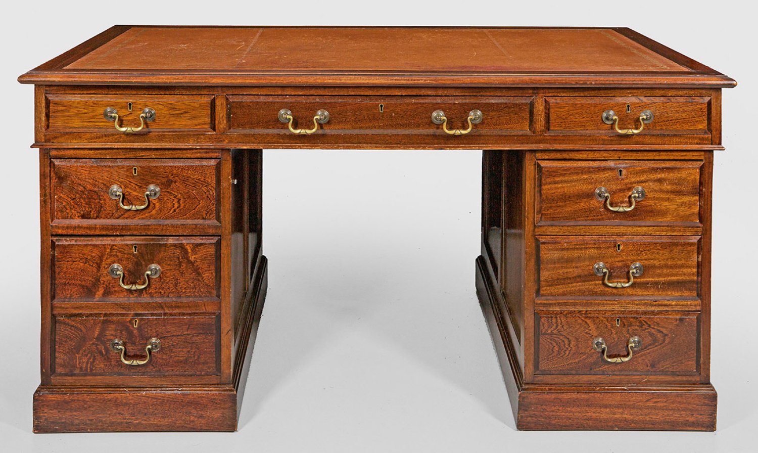 Mahagoni, furniert. Gerade, rechtechteckige Podestelemente auf gerader Zarge. In der gegliederten Front drei bzw. zwei Schubladen. Oberhalb breiter, dreischübiger Zargenkasten. Profilierte Deckplatte mit eingelegter Arbeitsfläche aus Leder. H. 77 cm. 152 cm x 91 cm.