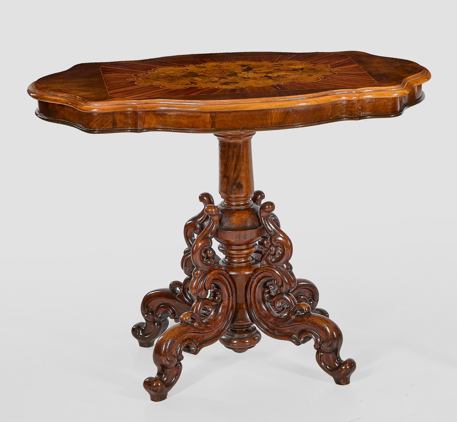 Nussbaum, massiv und furniert sowie Einlagen aus unterschiedlichen, teilw. gefärbten Edelhölzern. Mehrfach gegliederter Balusterschaft auf durchbrochen gearbeiteten Volutenbeinen als Träger für passig geschweifte Zarge und gering überstehende, profilierte Deckplatte mit großflächiger Blütenintarsie. H. 77 cm. 99 cm x 63 cm.
