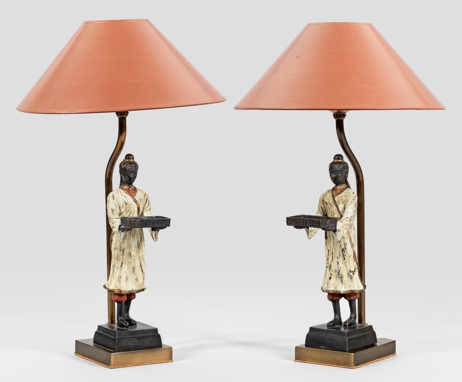1-flg.; Messing, teilw. farbig gefasst. Über rechteckigem, gestuft ansteigendem Sockel vollplastische Darstellung von chinesischen Figuren mit einem Tablett. Dahinter schlanker Schaft als Träger für Leuchtmittel. Konischer Lampenschirm. Elektrifiziert. H. 42 cm.