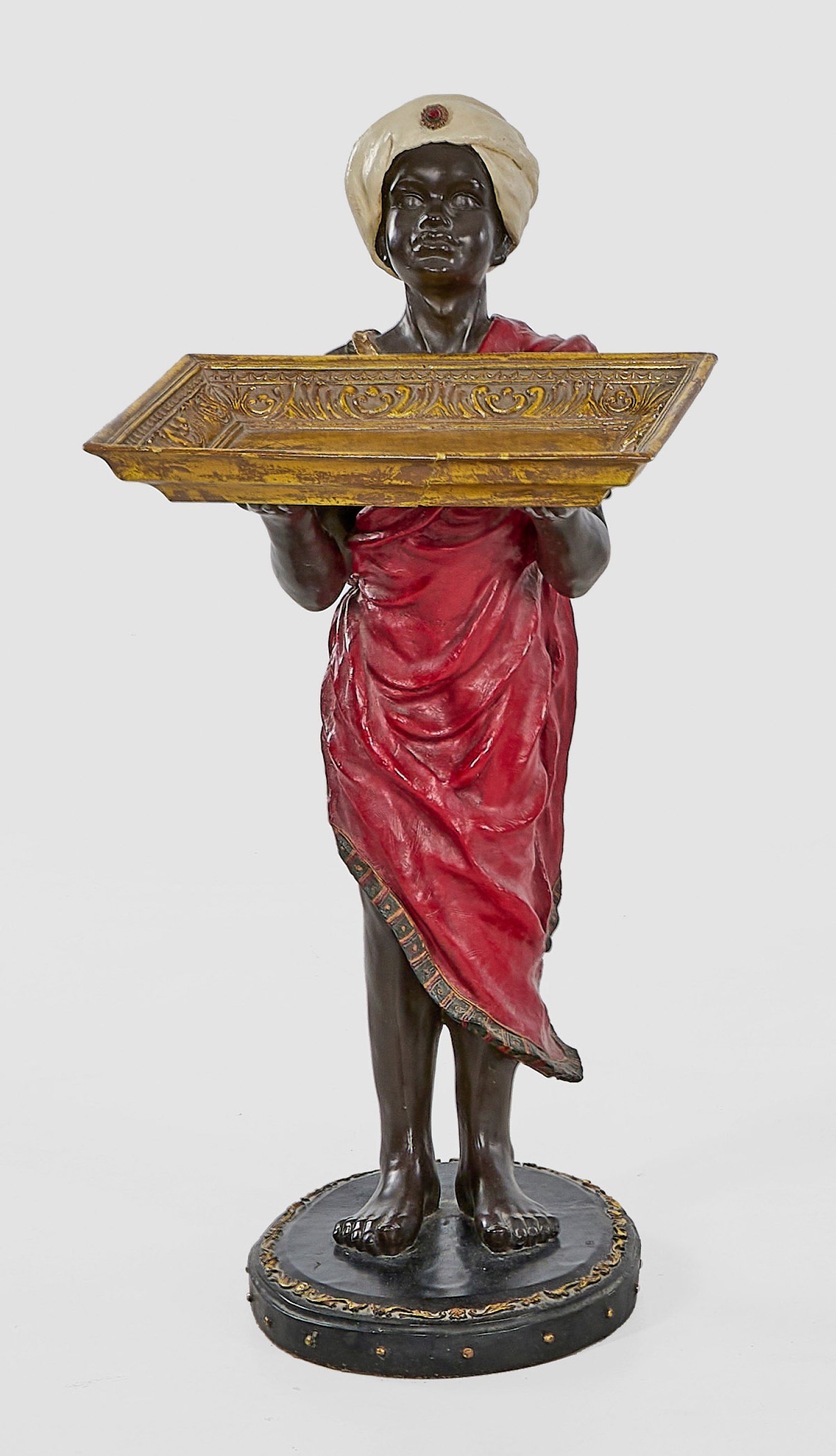 Farbig staffiertes, und teilw, vergoldetes Fieberglas. Über profiliertem Sockel vollplastische Darstellung eines Orientalen, ein breit gerahmtes Tablett emporhaltend. Rep.; H. 88 cm.