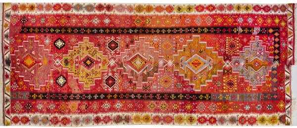 Türkei. Anatolien. Wolle auf Wolle, flach gewebt. Im roten Innenfeld flächendeckende Musterung aus großen, gereihten Rautenmotiven sowie kleinen, hakenbesetzten Rauten im Rapport. Umlaufend elfenbeinfarbene Bordüre. 438 cm x 168 cm.