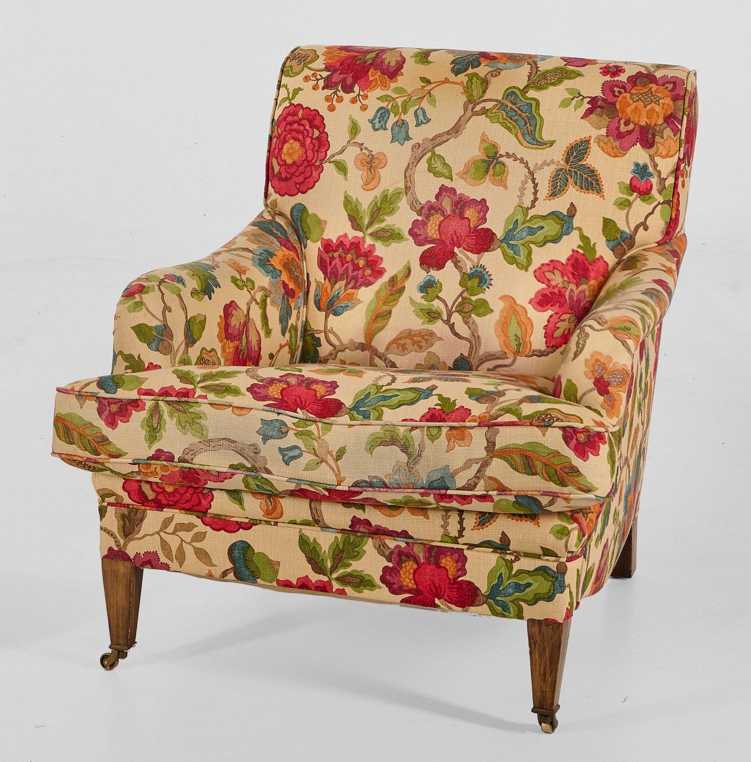 Trapezförmige Zarge auf konischen Vierkantbeinen, frontseitig mit Rollen. Schräggestellte Sitzfläche, gerundete Armlehnen sowie breite, zurückschwingende Rückenlehne. Gepolstert und allseitig mit großflächig floral ornamentiertem Stoff bezogen. H. 80 cm. 78 cm x 94 cm. Sitz-H. 42 cm.