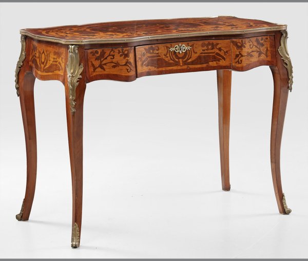 Palisander und Rosenholz, furniert. Bombierter, dreischübiger Zargenkasten auf sich konisch verjüngenden, geschweiften Beinen. Gering überstehende, profilgerahmte Deckplatte. Allseitig breit gerahmte Furnierfelder mit üppigen, eingelegten Blattranken, Blütenkorb und Bandeinlagen. H. 80 cm. 111 cm x 59 cm.