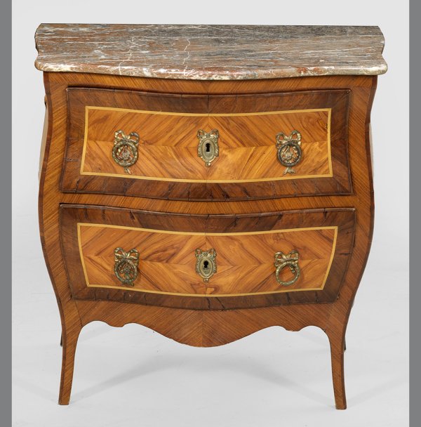 Rosenholz und Palisander, furniert. Bombierter Korpus, flankiert von schmalen Ecklisenen, in ausgestellte Beine übergehend. In der gegliederten Front zwei Schubladen. Flächendeckend breit gerahmte, gespiegelt angeordnete Furnierfelder, von Bandeinlagen begrenzt. Gering überstehende, fixierte Deckplatte aus rotbraunem, weiß-grau gemasertem Marmor. Altersspuren. H. 80 cm. 80 cm x 50 cm.