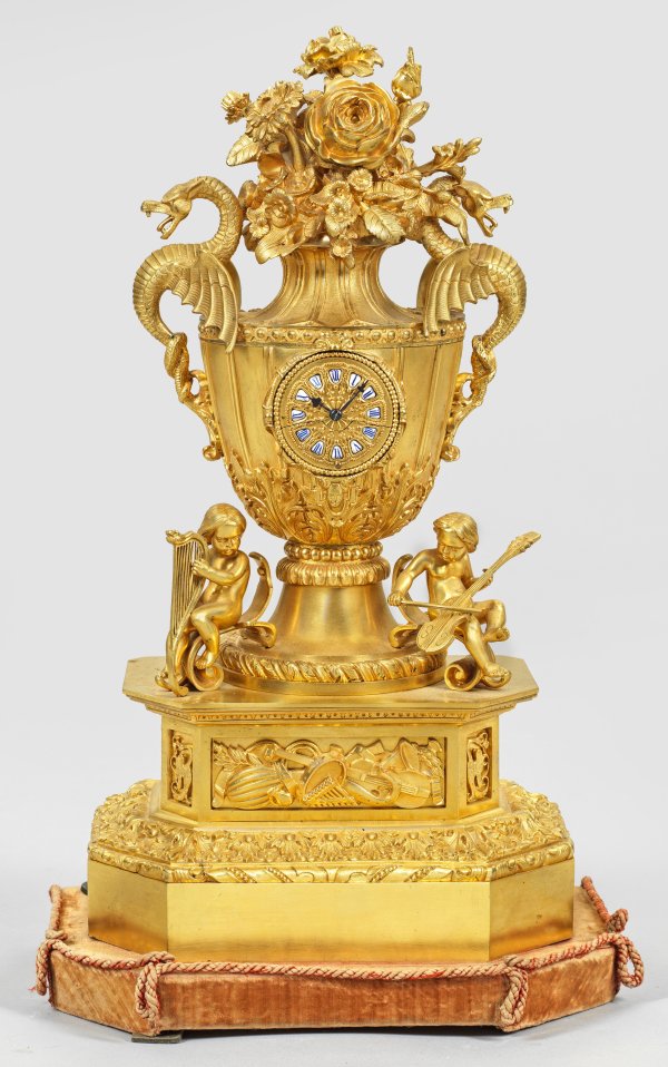 Bronze, vergoldet. Über gestuft ansteigendem Podestsockel mit breitem Fries aus Blattwerk sowie erhaben reliefierten Attributen der Musik vollplastische Darstellung von musizierenden Putten. Vasenförmiger Korpus mit Akanthusfries sowie plastisch gestalteten Henkeln in Gestalt von Drachen. Bekrönung aus üppigem Blütenbouquet. Reliefiertes Zifferblatt mit Emailreserven. Pendulenwerk mit Fadenaufhängung sowie Halbstundenschlag auf Glocke. Platine bez. Brevete. Plinthe aus samtbespanntem Holz. Ges.-H. 50 cm.