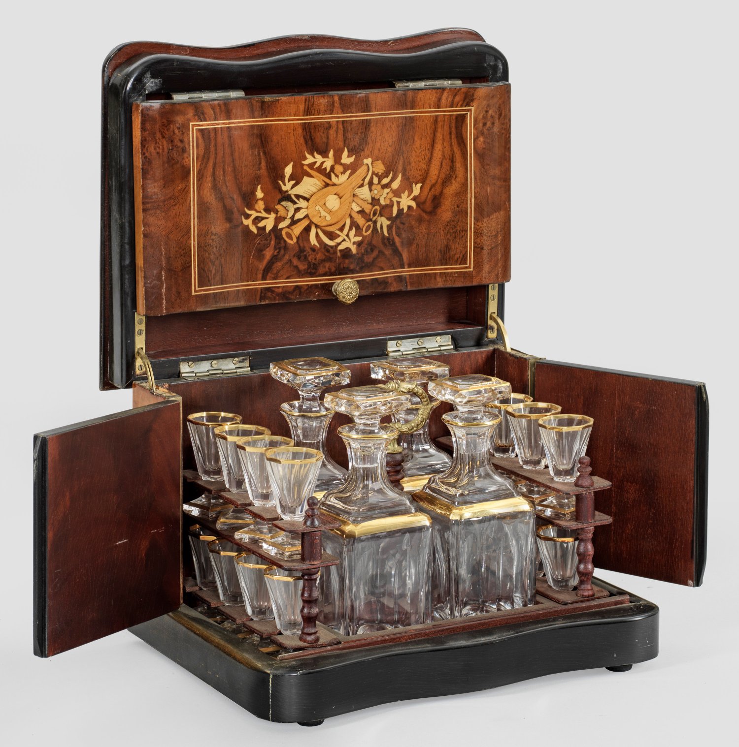 sog. Tantalus. Nussbaum, furniert und Einlagen aus unterschiedlichen Edelhölzern. Rechteckiger, in der Front geschweifter Korpus, schauseitig mit intarsierten Attributen der Musik. Innen herausnehmbarer Étagèreneinsatz mit vier Karaffen sowie 16 Likörgläsern. Altersspuren. H. 25,5 cm. 35 cm x 27 cm.