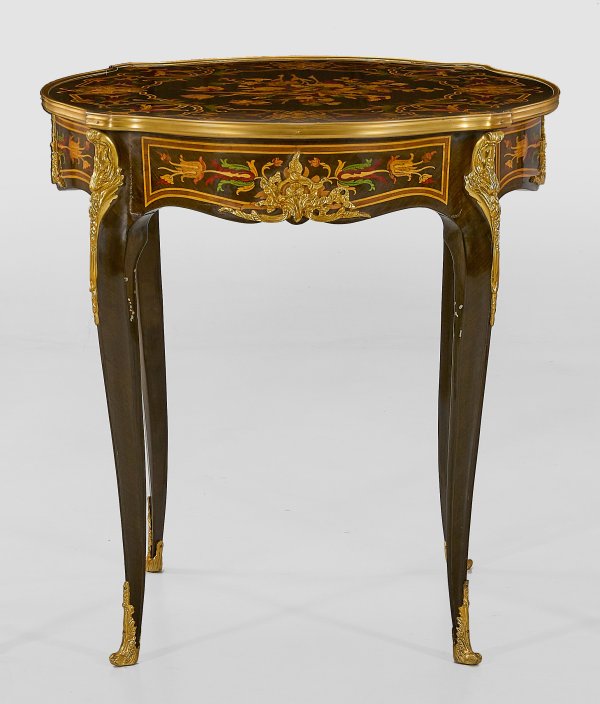 Makassar, furniert sowie Einlagen aus teilw. gefärbten Edelhölzern. Passig geschweifte, bombierte Zarge auf hohen, geschwungenen Beinen. Entsprechende, gering überstehende, umlaufend profilierte Deckplatte. Gespiegelt angeordnete Furnierfelder sowie reicher Dekor aus Blüten und Bandelwerk. H. 75 cm. D. 75 cm.