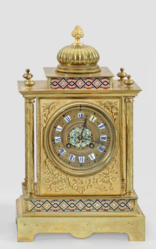 Messing und Bronze sowie polychromer Emaildekor. Über profiliertem Sockel rechteckiger, floral reliefierter Korpus, flankiert von eingestellten Vollsäulen. Kuppelförmiger oberer Abschluss. Schauseitig schmale Friese mit geometrischem Cloisonnédekor. Verglastes Zifferblatt sowie Pendulenwerk mit Pendelfeder und Schlagwerk auf Tonfeder. Platine bez. made in France. Pendel fehlt. H. 35 cm. 19,5 cm x 11,5 cm.