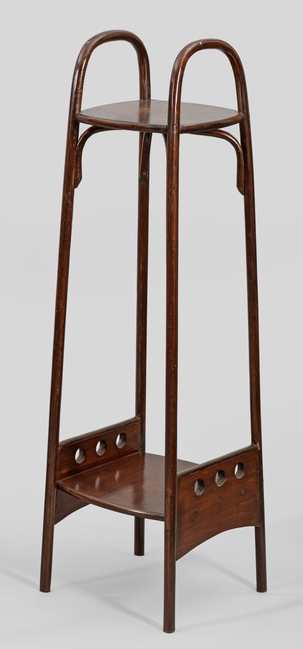 Buchenholz, mahagonifarben gebeizt. Gestell aus stark gebogten Rundstäben und gegeneinander gestellten Streben als Träger für gestaffelt angeordnete, gerundete Ablageflächen. Unbez; Entw. Josef Hoffmann, um 1904. H. 121 cm.