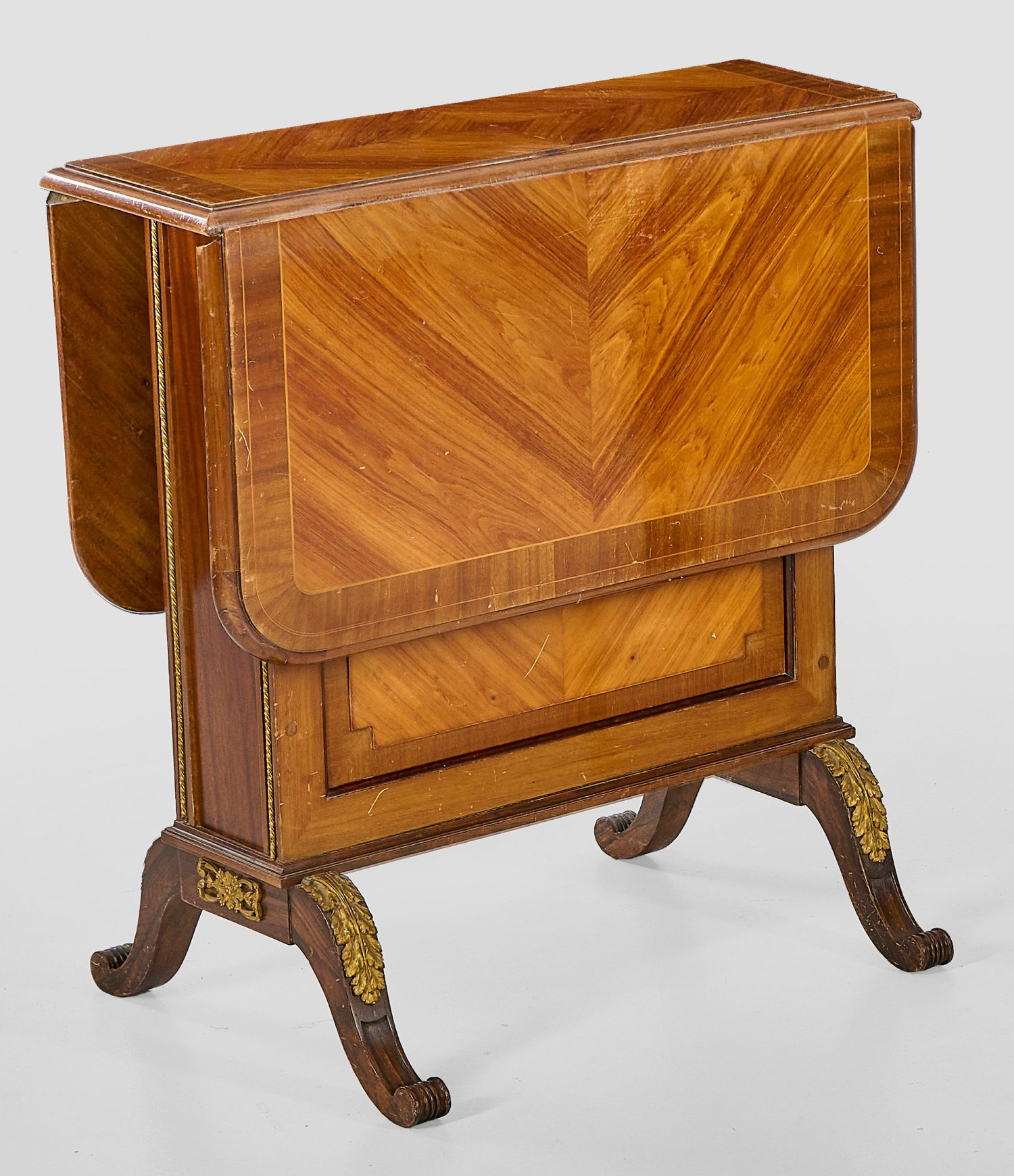 Mahagoni und Rosenholz, furniert sowie Applikationen aus vergoldeter Bronze. Über geschweiften Volutenbeinen hochrechteckiger Korpus mit seitlichem Ablagefach als Träger für aufstellbare Deckplatte. H. 68 cm. 23/86 cm x 64 cm.