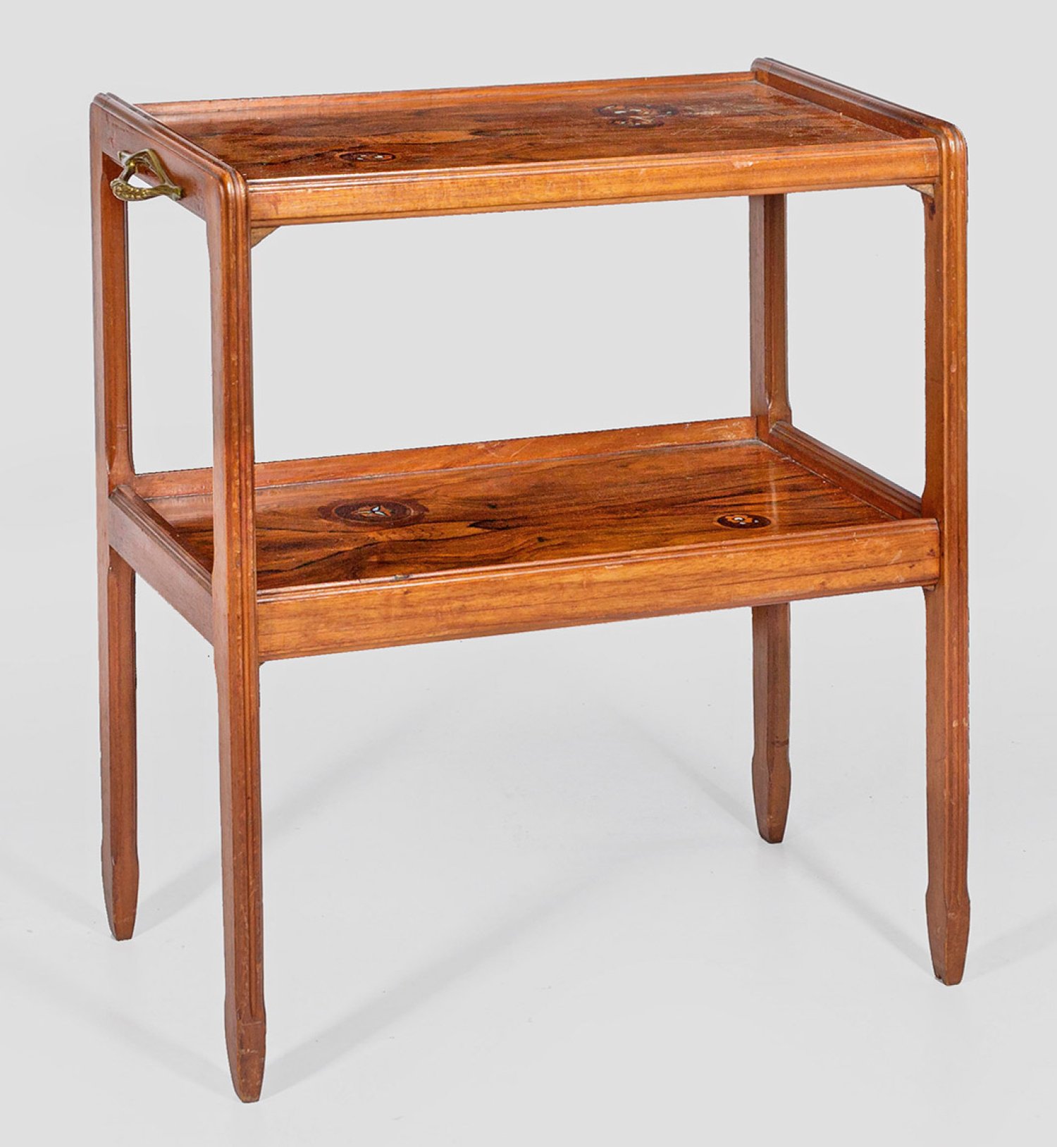 Modell No. 406. Mahagoni, massiv und Palisander, furniert sowie unterschiedliche Einlagen, teilw. aus Perlmutter. Gestell aus geraden, profilierten und abgerundeten Streben mit seitlichen Griffen sowie mit rechteckigen, leicht vertieften Ablageflächen. Bez. Majorelle, Nancy. H. 77 cm. 71 cm x 40 cm.