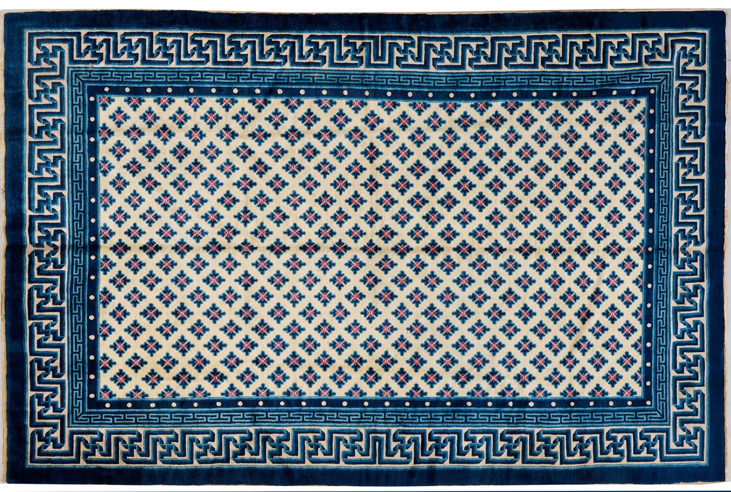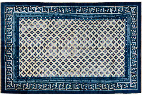 China. Wolle auf Baumwolle. Im cremefarbenen Innenfeld flächendeckend dichte Musterung aus Rosettenmotiven im Rapport. Umlaufend breite, mehrteilige Bordüre aus Mäander- und Swastika-Bändern in zweifarbigem Blau. 281 cm x 177 cm.