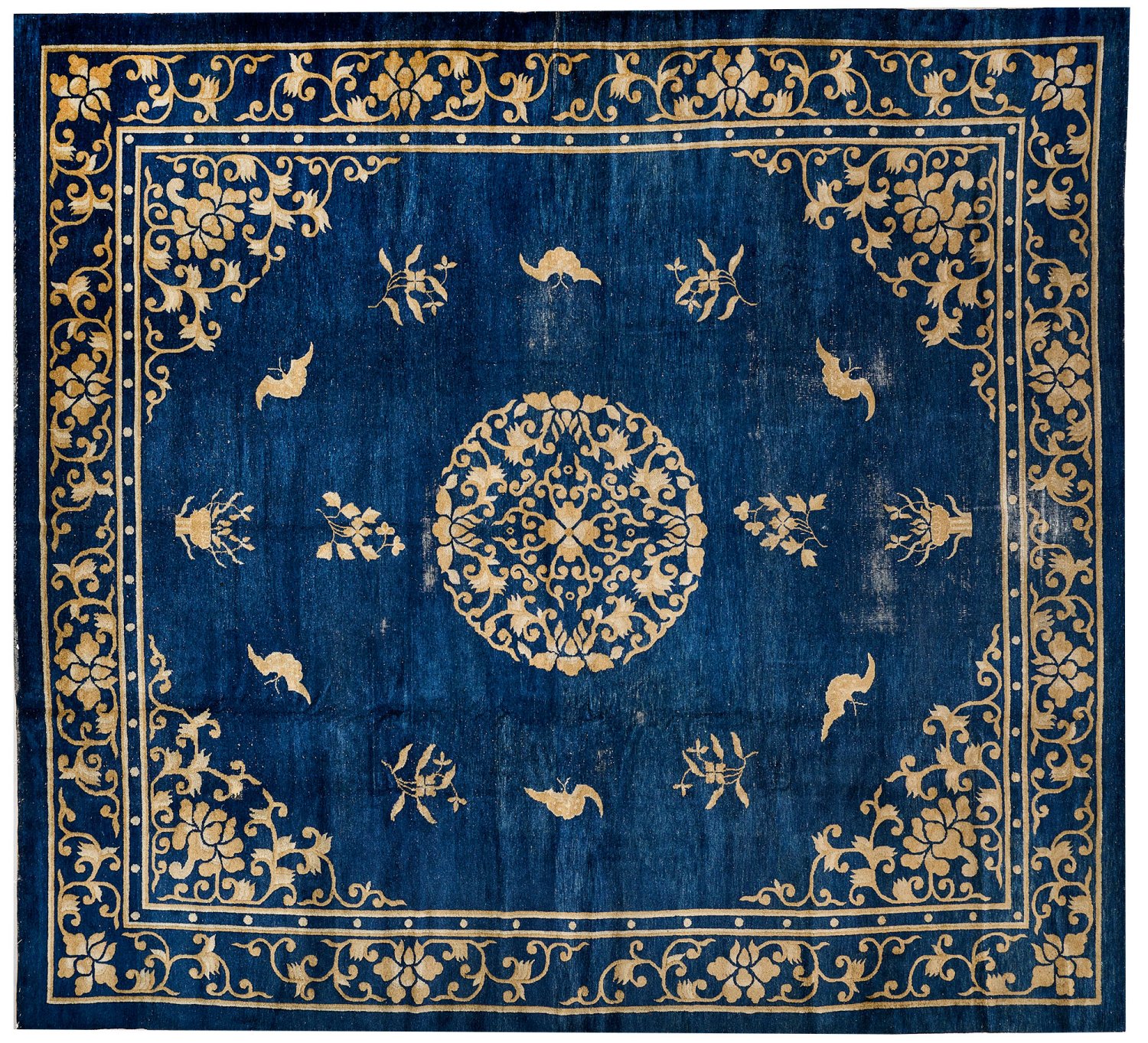 China. Um 1920-1930. Wolle auf Baumwolle. Im tintenblauen Innenfeld großes Zentralmedaillon und entsprechende Ecklösungen aus Blattranken. Lose gestreute Musterung aus Schmetterlingen und Blüten. Umlaufend breite Bordüre mit korrespondierender Musterung. 378 cm x 347 cm.