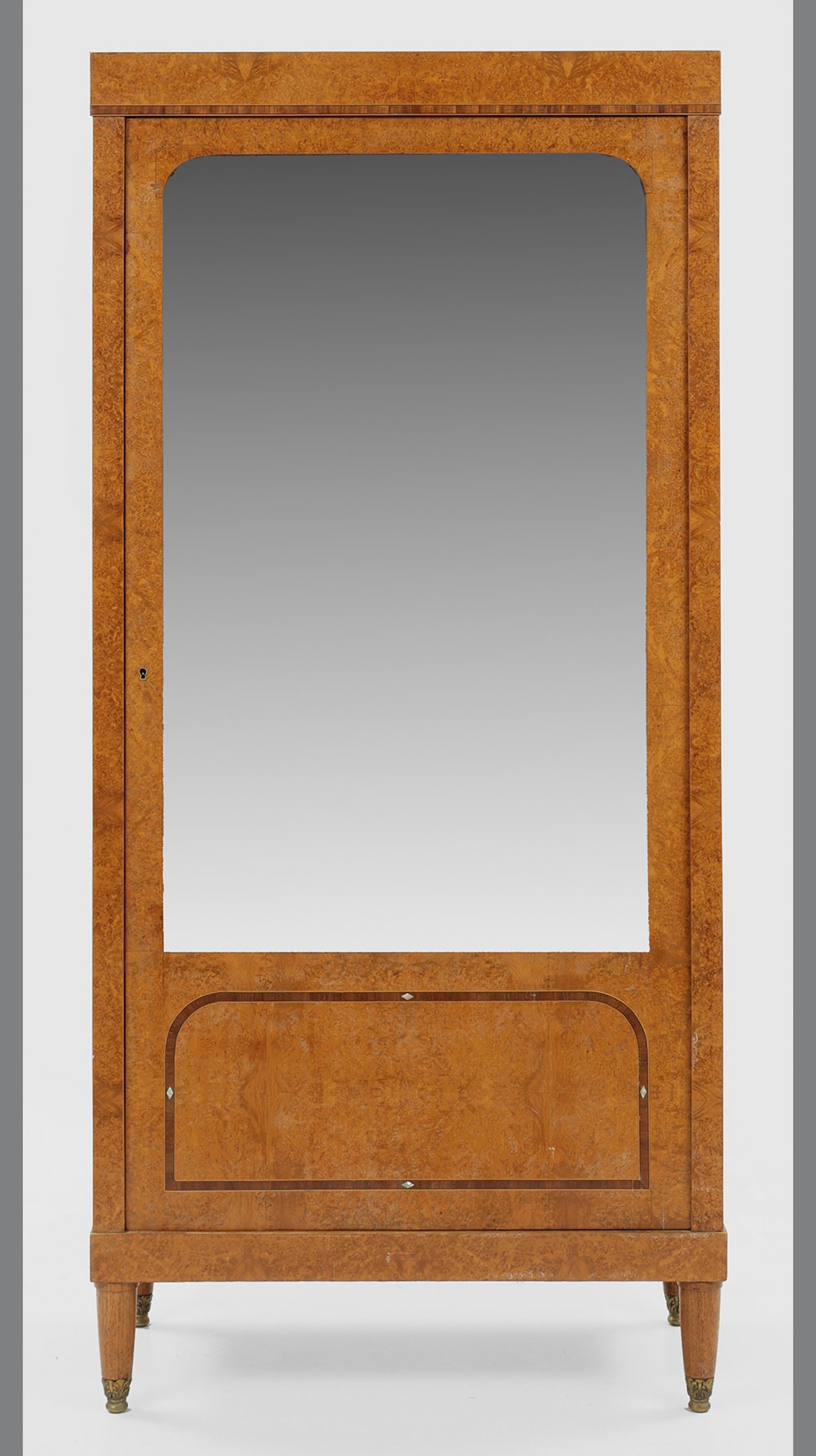 Nussbaummaser, furniert. Gerader, hochrechteckiger, dreiseitig facettverglaster Korpus auf konischen Rundbeinen. In der gegliederten Front große Vitrinentür sowie innen verspiegelte Rückwand und Einlegeböden aus Glas. H. 172 cm. 80 cm x 40 cm.
