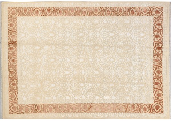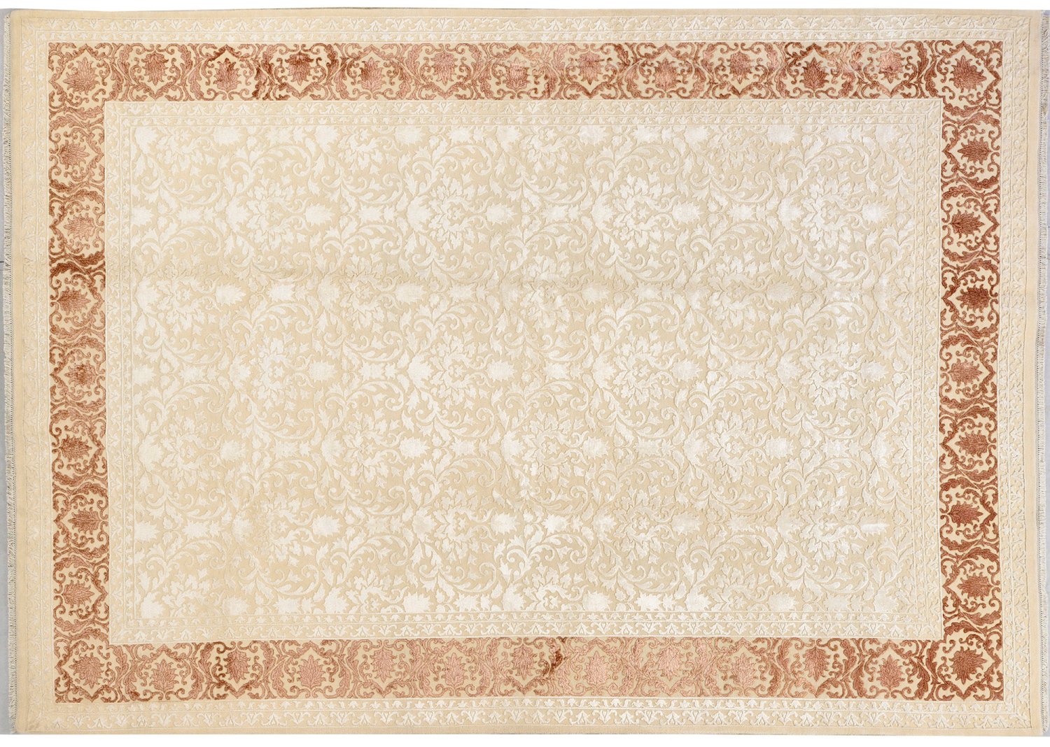 Wolle mit Seide auf Baumwolle. Reliefmuster. Auf beigefarbenem Fond flächendeckende, cremefarbene Ornamentmusterung aus arabesk angeordnetem Rankenwerk. Umlaufend breite apricotfarbene Bordüre aus dicht gereihten Palmetten. 253 cm x 358 cm.
