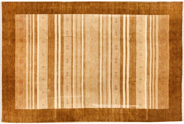 Wolle auf Baumwolle. Im Innenfeld flächendeckende Streifenmusterung in unterschiedlichen Beige- und Brauntönen. Umlaufend breite, abraschierte Rahmung. 292 cm x 202 cm.