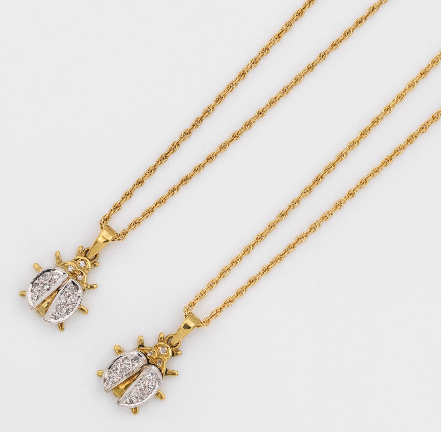 Gelbgold, gest. 585. Anhänger in Form vom Marienkäfern besetzt mit Diamanten von zus. ca. 0,14 ct. (p/w). Zwei feine Ankerketten. Ges.-Gew. ca. 7,28 g.